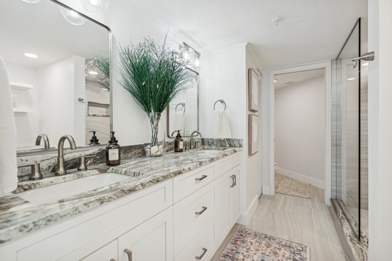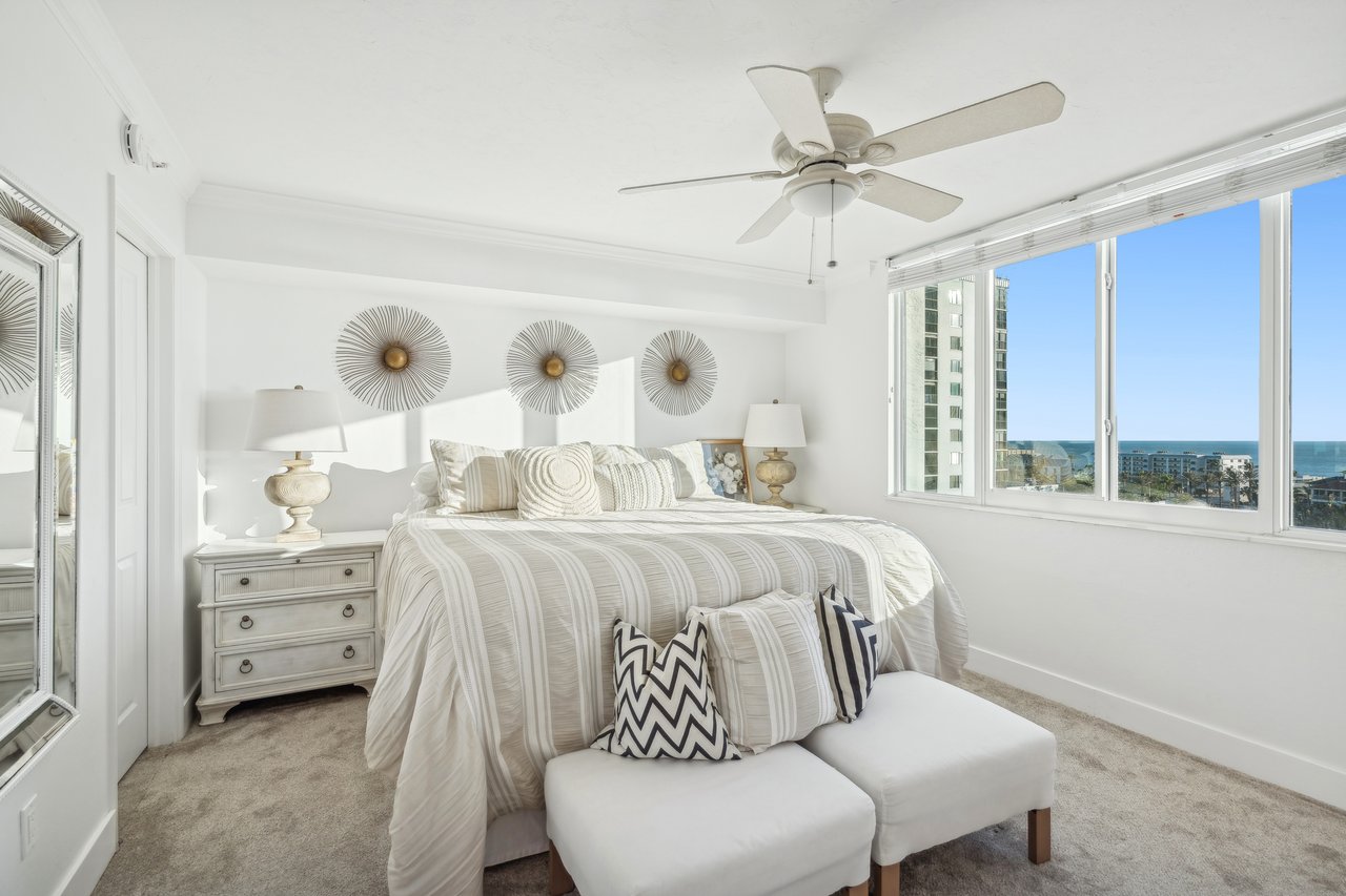 The master suite offers direct Gulf views, a walk-in closet and a remodeled bath with dual vanities, granite countertops and a glass walk-in shower. The guest bedroom and second full bath are ideally positioned for comfort and privacy when hosting family or friends. Most updates were completed in 2021 or later. Additional features include hurricane-impact windows, crown molding, fresh interior paint and updated trim throughout.