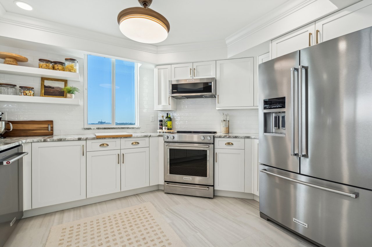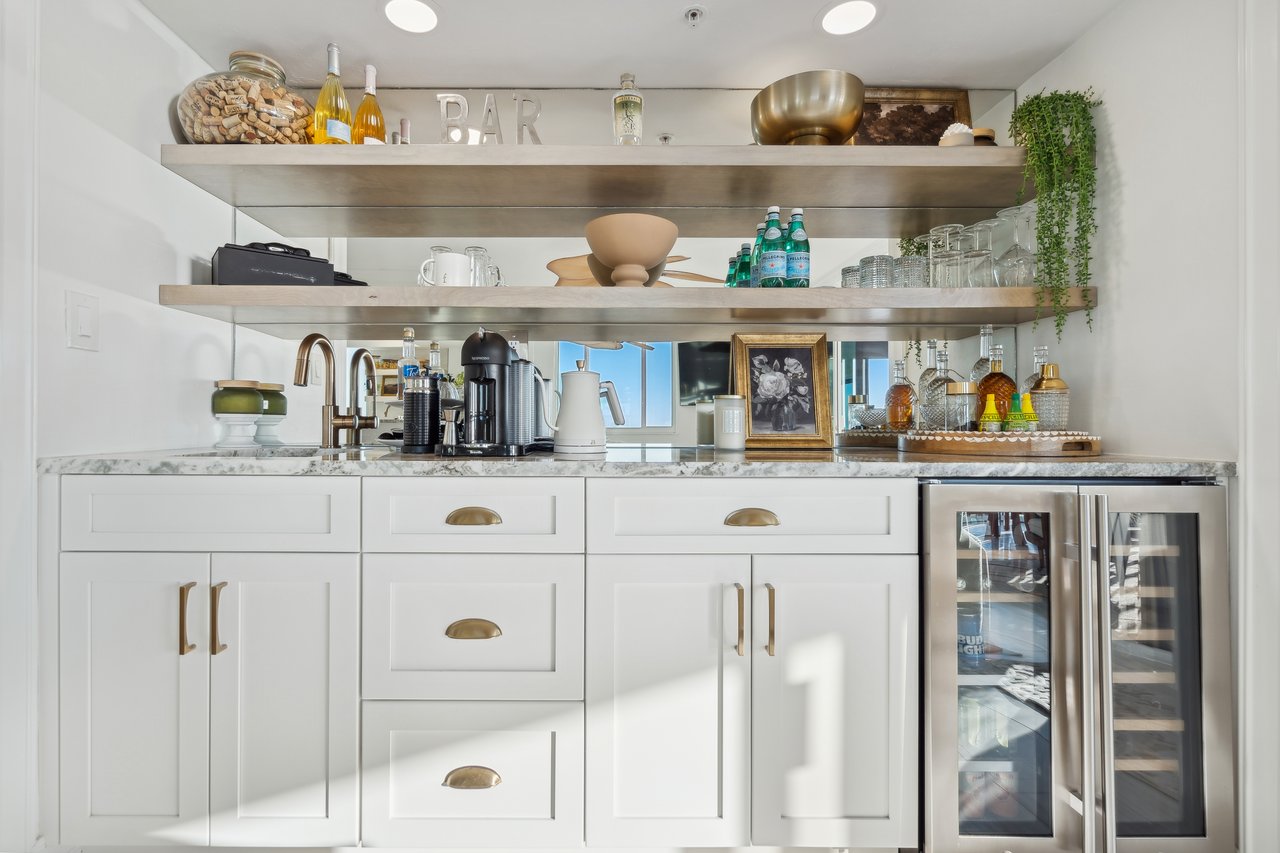 The updated kitchen features custom cabinetry, granite countertops and matching KitchenAid appliances still under warranty, while porcelain tile flows through the main living areas. The open-concept great room includes a wet bar and sliding doors that lead to a private lanai overlooking the Gulf, the perfect setting to unwind and take in endless sunset views.